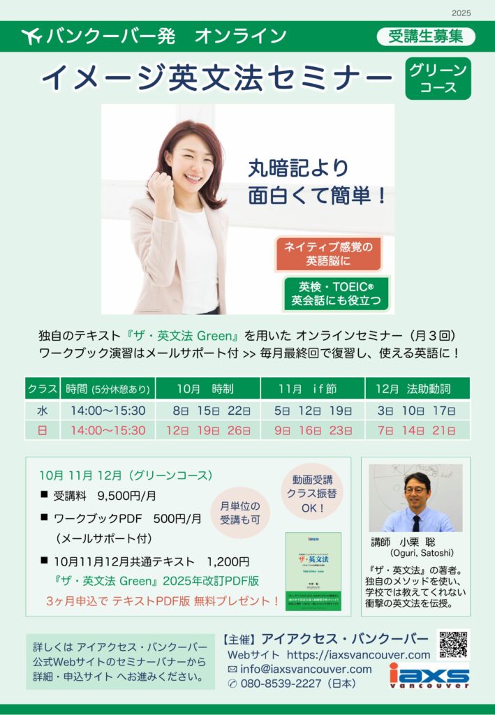 10月〜12月の3ヶ月をお申込みいただきますと、テキスト『ザ・英文法 グリーン』(PDF版)を無料プレゼントいたします。
